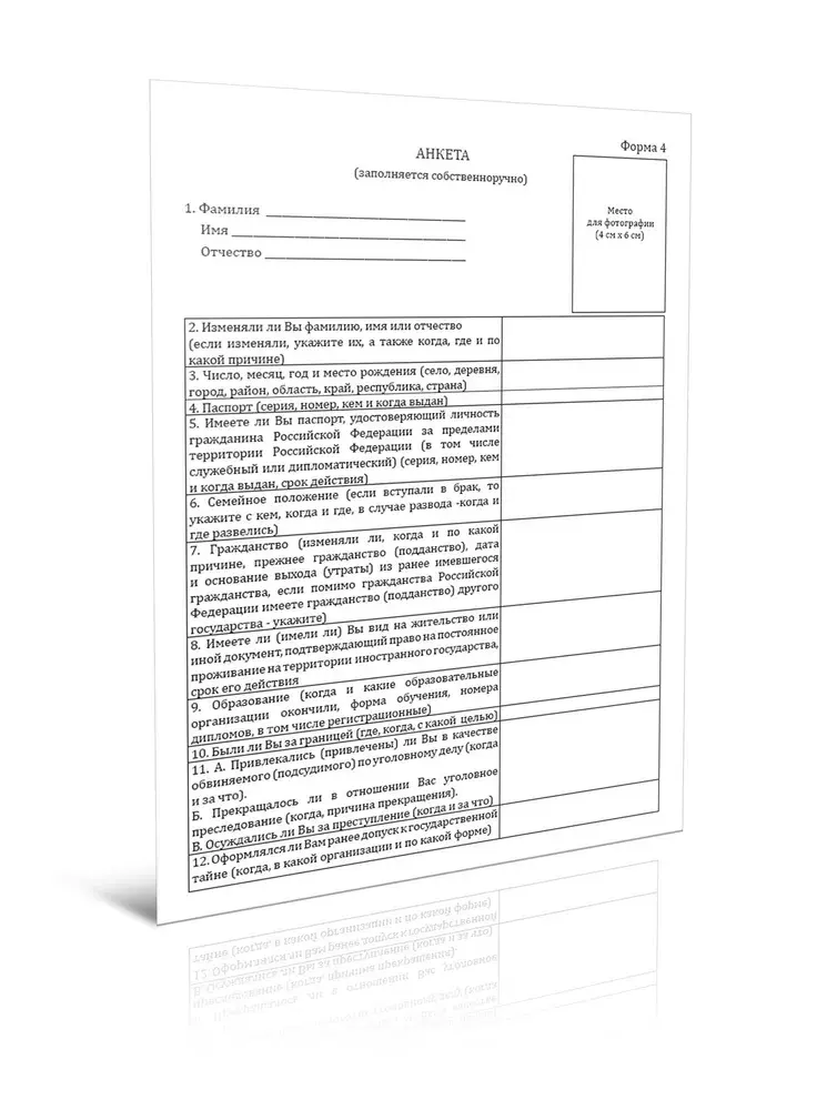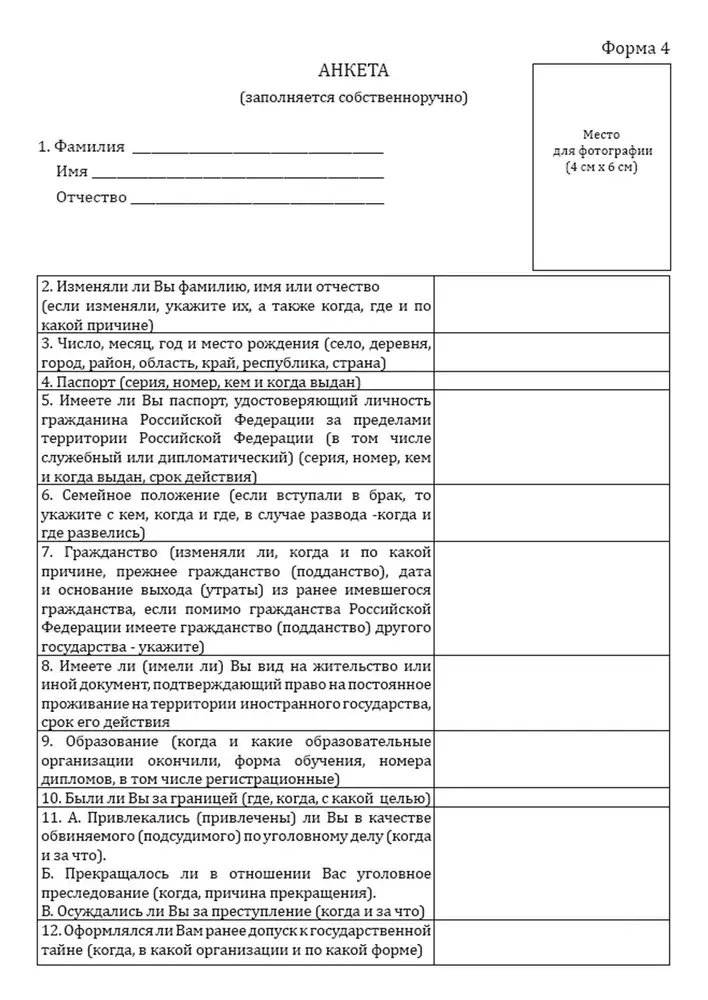 Форма анкеты (№4) соответствует Приложению к Постановлению Правительства РФ от 07.02.2024 N 132 "Об утверждении Правил допуска должностных лиц и граждан Российской Федерации к государственной тайне"