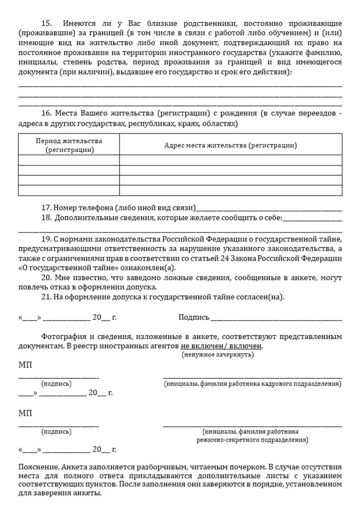 Гражданин, которому оформляется (переоформляется) допуск к государственной тайне, представляет в кадровое подразделение собственноручно заполненную и подписанную Анкету, документы, удостоверяющие личность и подтверждающие указанные в анкете сведения о себе и близких родственниках, а также справку об отсутствии медицинских противопоказаний для работы со сведениями, составляющими государственную тайну.